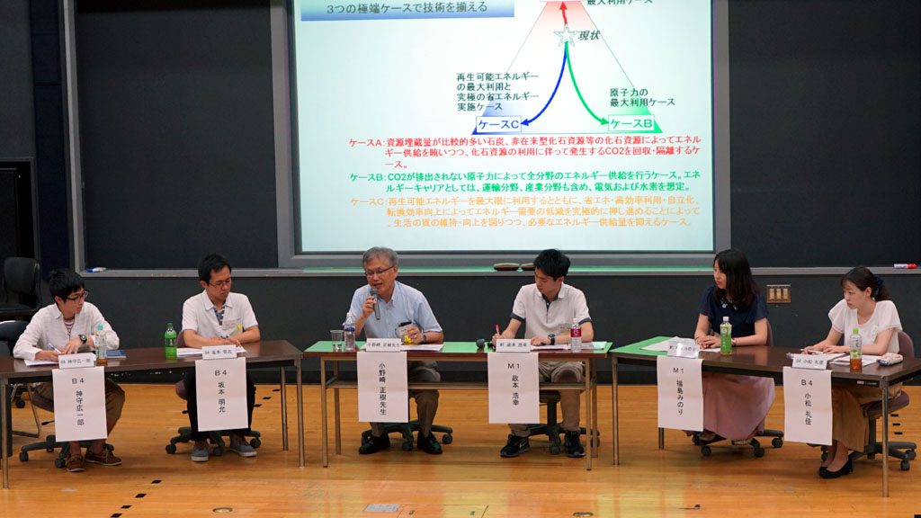 学生時代には無機化学を専攻されており、小堀様とは同じ研究室で直属の先輩というご関係だったそうです。現在はJXTGエネルギーにて機能材料を研究される傍らで、二児の母として育児もされているそうです。ご自身が開発に携わったナノインプリントの開発過程や有用性について、学生にも非常にわかりやすく説明してくださいました。また、仕事と育児の両立のために心がけていることや苦労している点、そしてやりがいを感じる瞬間についてもお話してくださいました。トラブルも見越して早めに仕事を進めておくことや、場合によっては仕事を他人と分担することも必要であり、また、理系は働くうえで専門性や思考力が強みとなるので、学生時代に必要なスキルを身につけておくべきであるというアドバイスをいただきました。